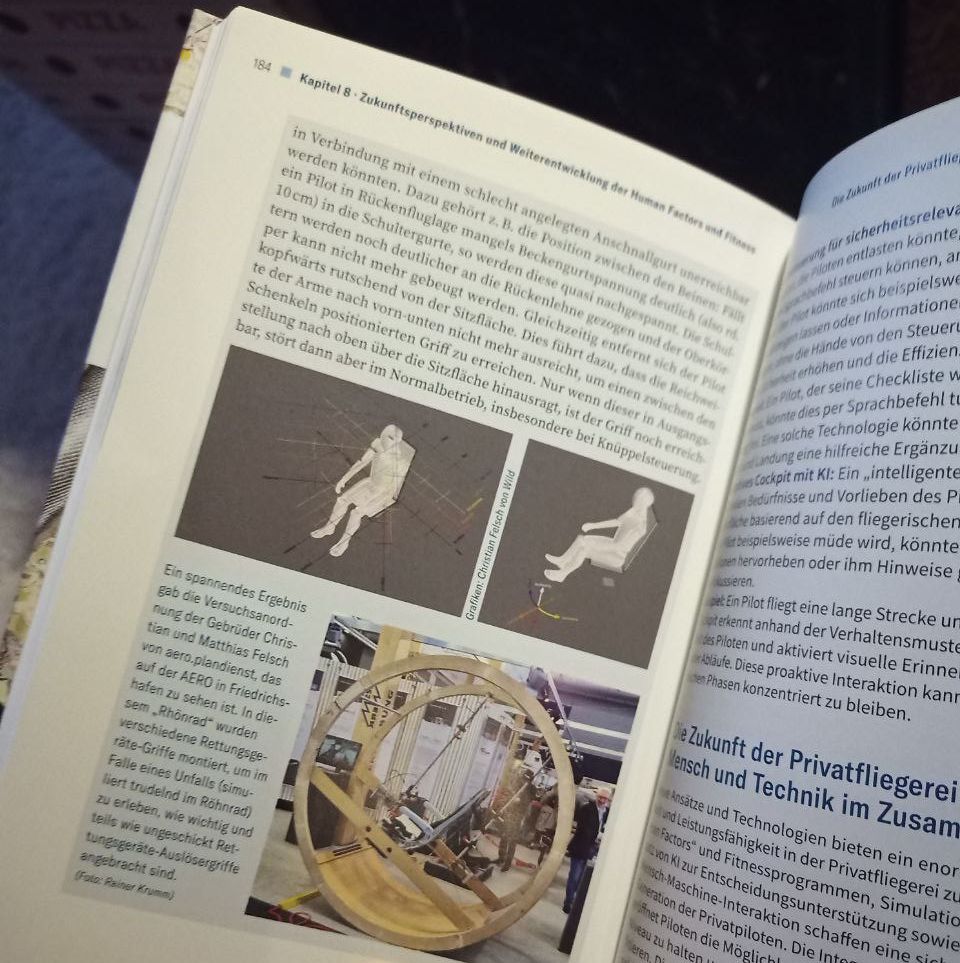 Unter dem Titel "Körperliche und mentale Fittness für Privatpiloten" geht das Buch auf verschiedenen Faktoren und Strategien ein, mit denen sich die Leistungsfähigkeit im Cockpit verbessern lässt. Dazu gehört auch eine anthropometrisch und ergonomisch korrekte Gestaltung von Cockpit und Bedienelementen, welche auch unter widrigen Bedingungen bedienbar sein müssten. Wie in einem Beitrag von uns im Buch dargestellt, ist dies leider nicht immer der Fall.